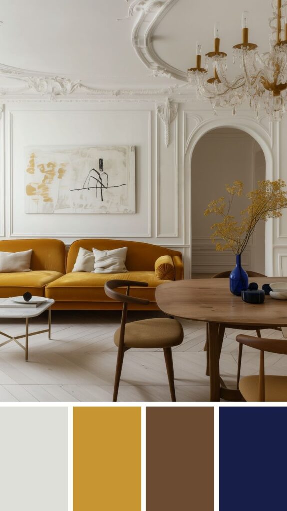 Predominan los tonos profundos: verde esmeralda, azul noche, burdeos, blanco y negro, a menudo realzados con toques metálicos.